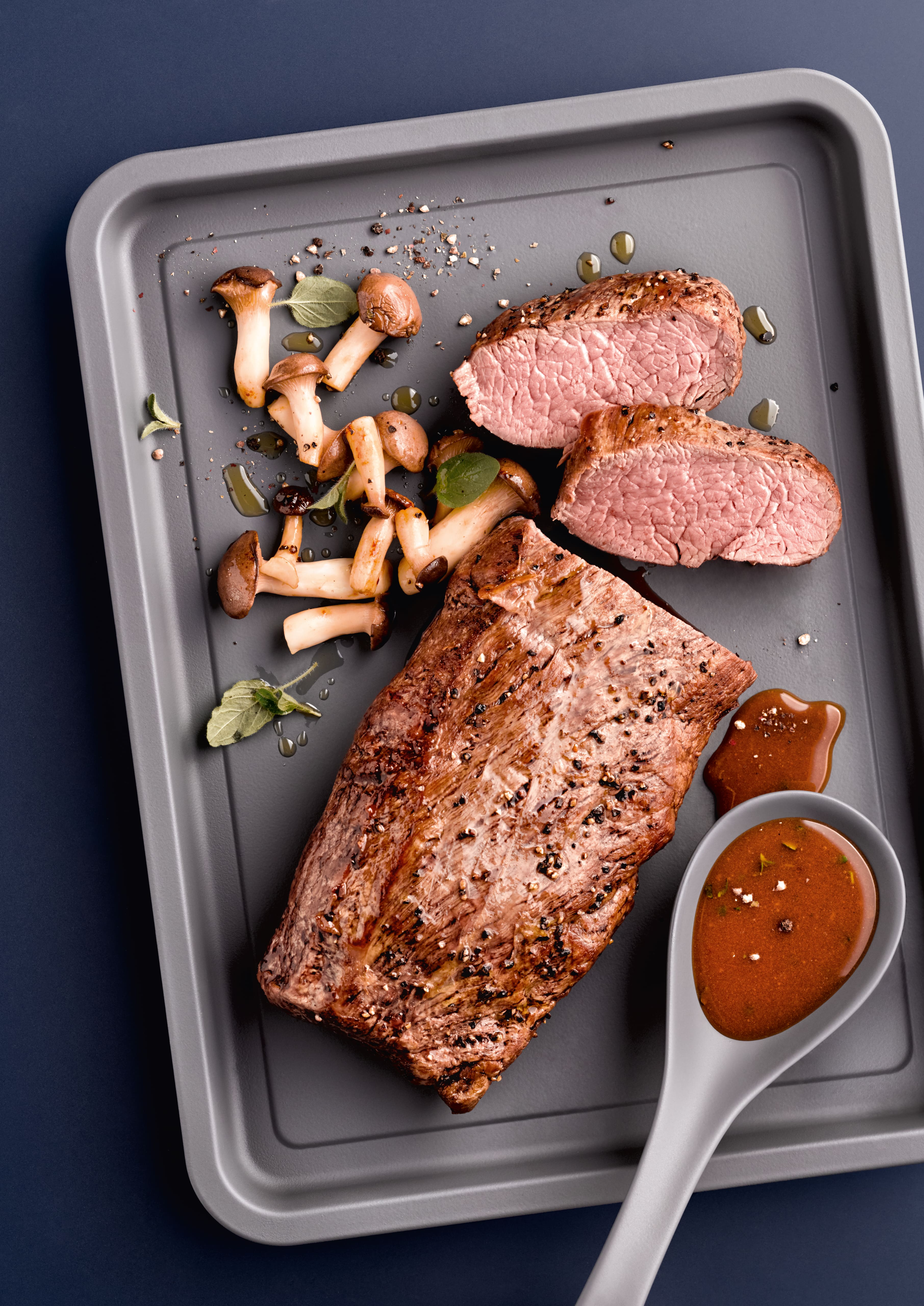 - Sear tenderloin: Using the Miele griddle, HUB casserole or large frying pan, sear the meat on the cooktop on all sides. When oven is at temperature, place the roast probe in the meat and slide into the oven.