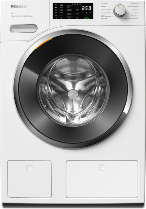 The washing machine is switched on (the program selector is pointing to a wash program).